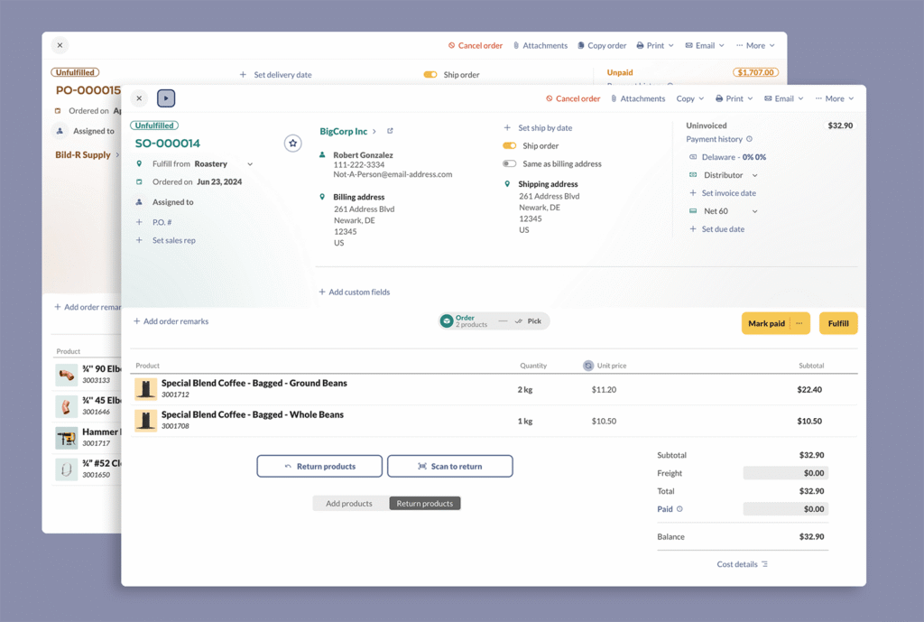Our updated order screens now show more relevant information–like contact details, shipping info, and billing details–right in the order header.
