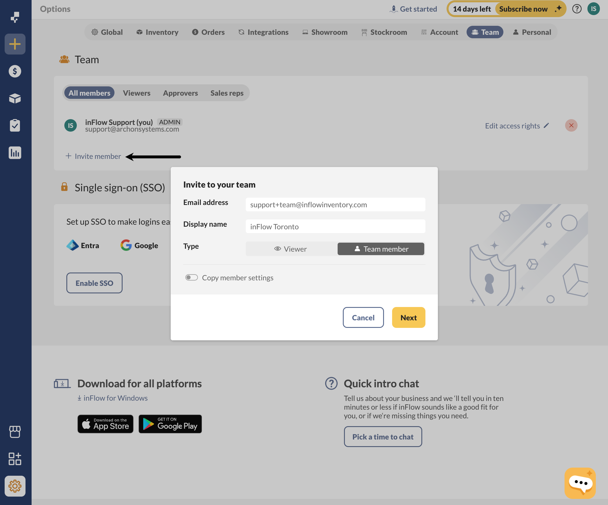 4. Select if the new user will be a Viewer with read-only access to inFlow, or a Team member, where you can adjust their access rights. Then click Next.