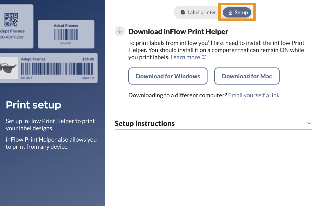 - Select the Setup tab, and download the inFlow Print Helper for your operating system.