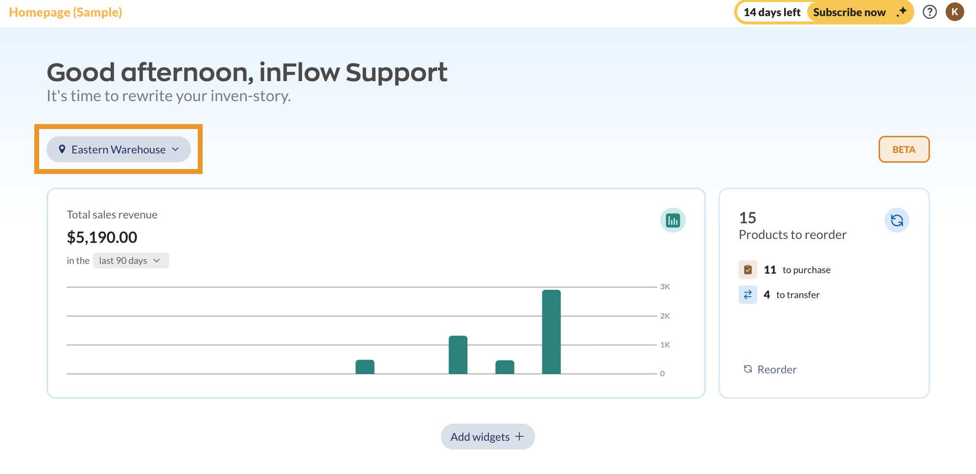 The Dashboard on inFlow for Web is being gradually rolled out to select accounts. If you’d like early access, please reach out to the inFlow team.