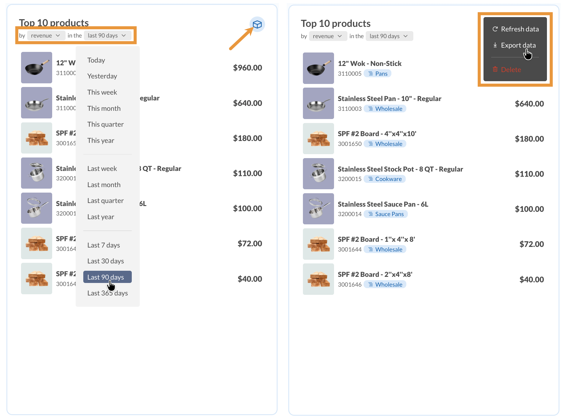 The icon in the top-right corner gives you access to the widget menu. This button lets you refresh the data, export it to a CSV file, or edit the widget.