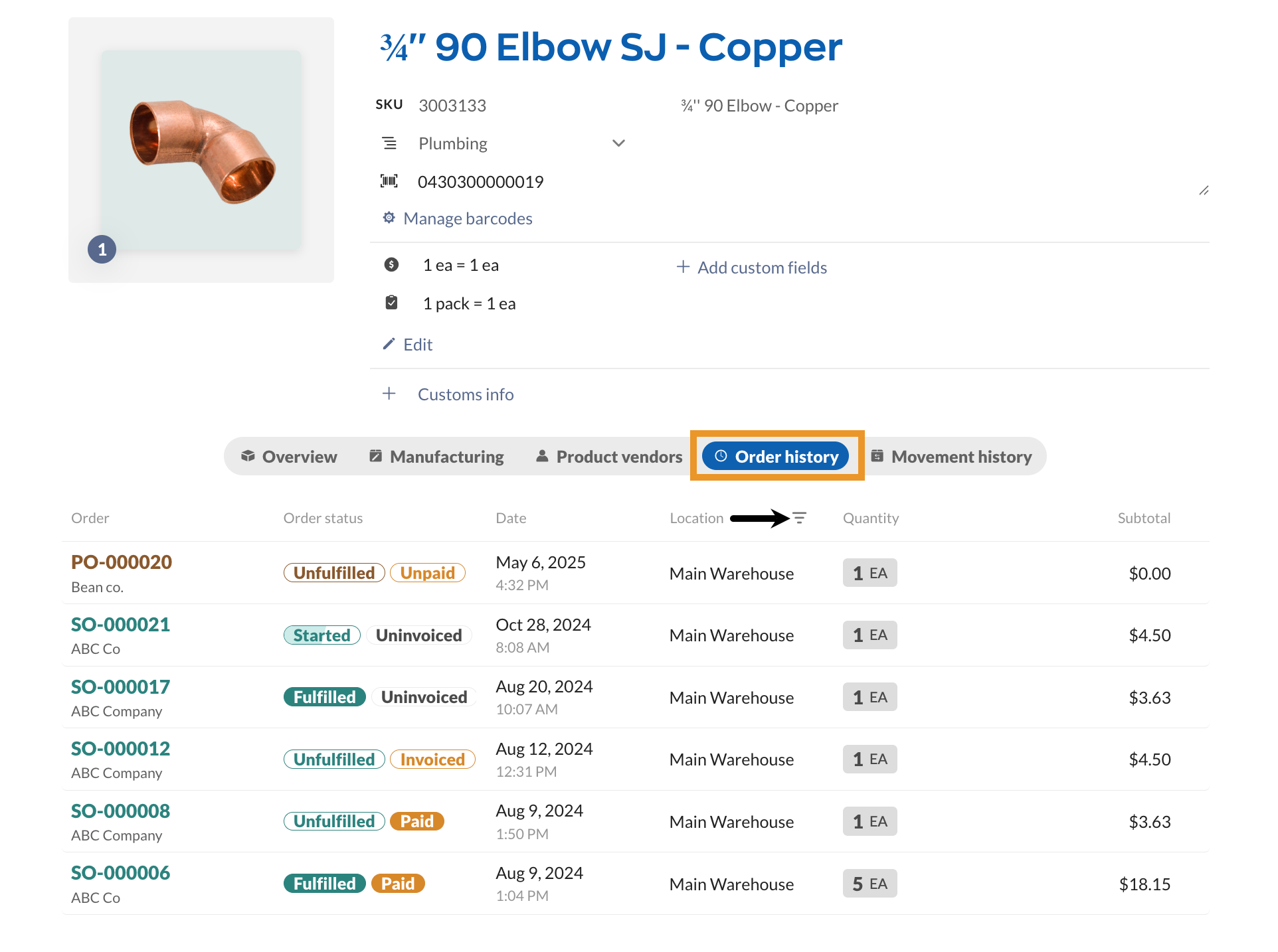 The Order history tab on the product record displays the last 100 sales, purchase, or manufacture orders for this product.