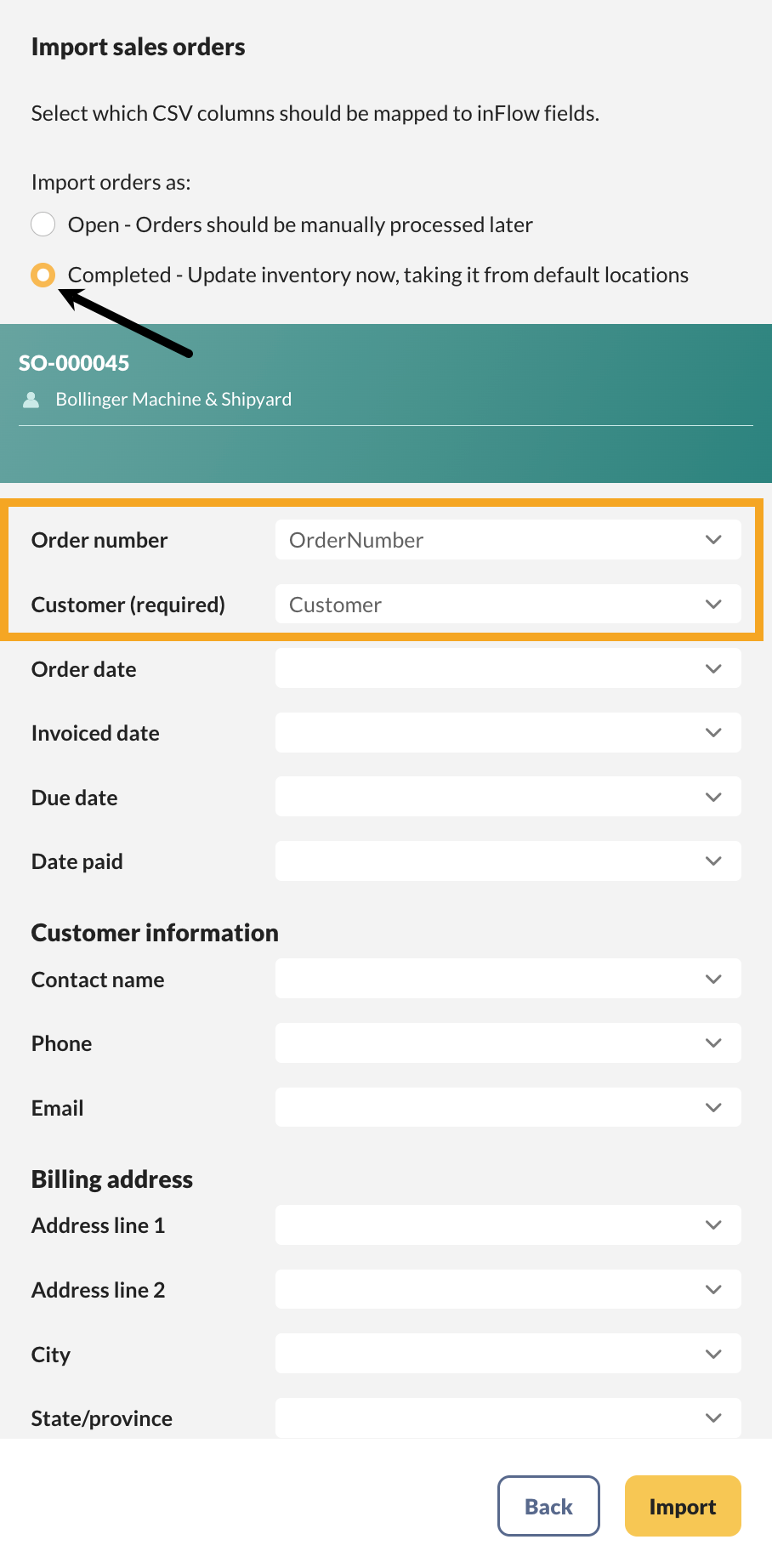 When you return to inFlow to import your sales orders, you will have two import options: