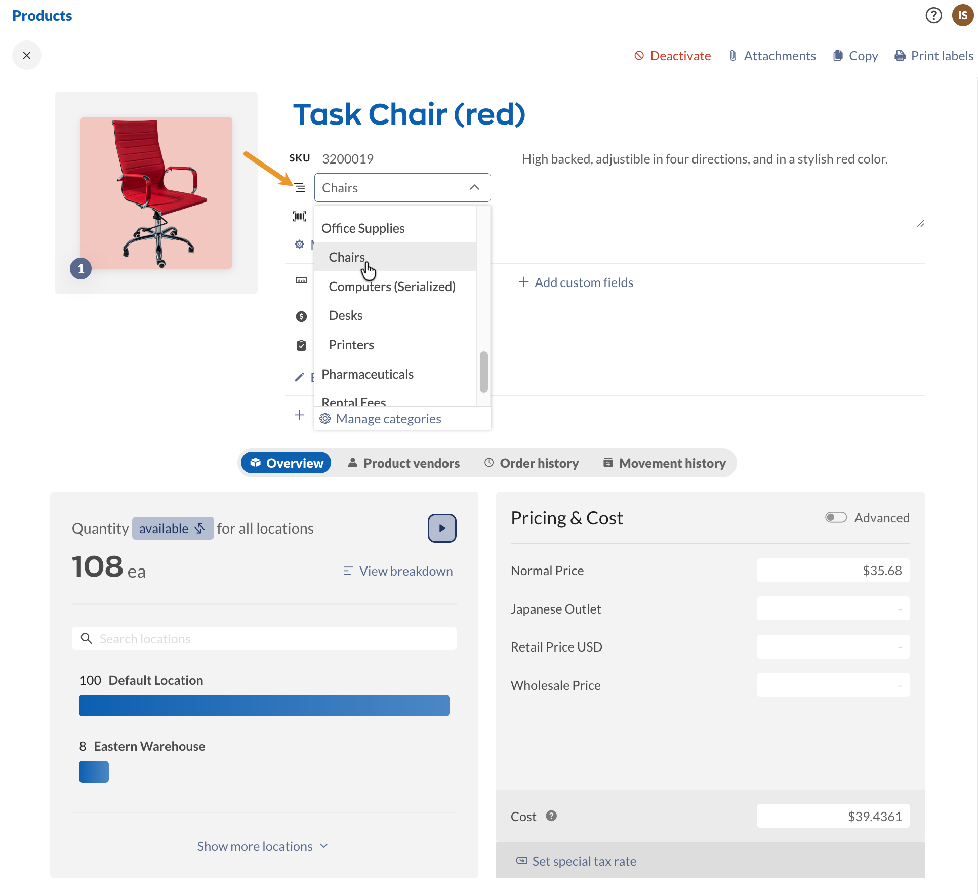 You can organize your products by choosing the correct category from the Product Record. New categories can be added to inFlow from the Product categories settings.