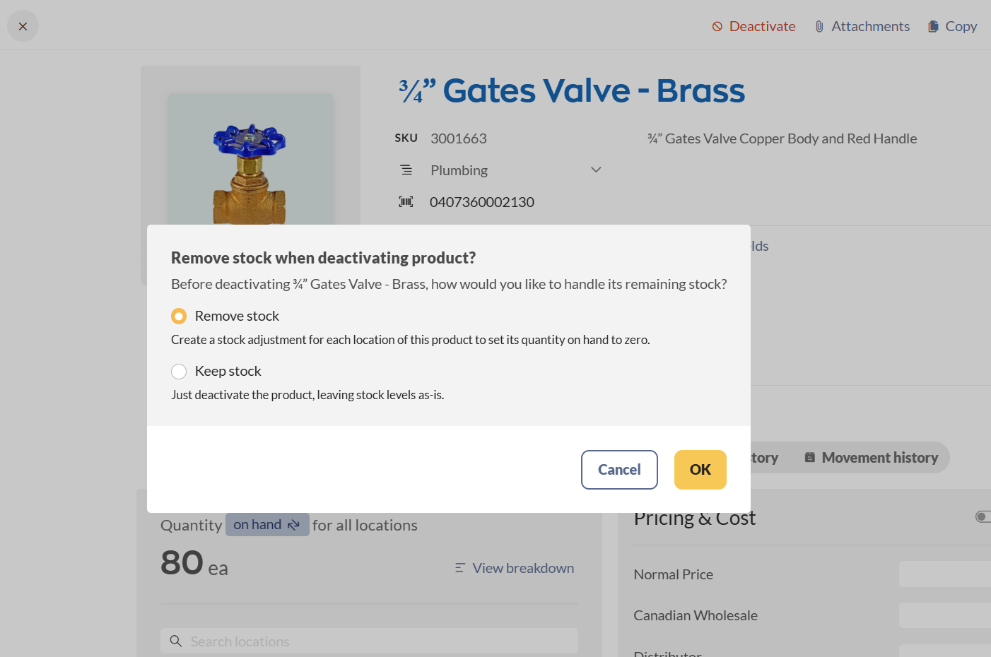 - Click the Deactivate button in the Action bar. If deactivating a product, inFlow can automatically create a stock adjustment to clear existing stock, or you can leave it as-is.