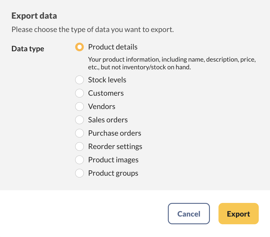 - Choose the type of data you’d like to export (Product Details, Sales Orders, Purchase Orders, Customers, etc.)
