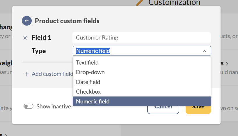 - Toggle the Show inactive button to view all deactivated custom fields.