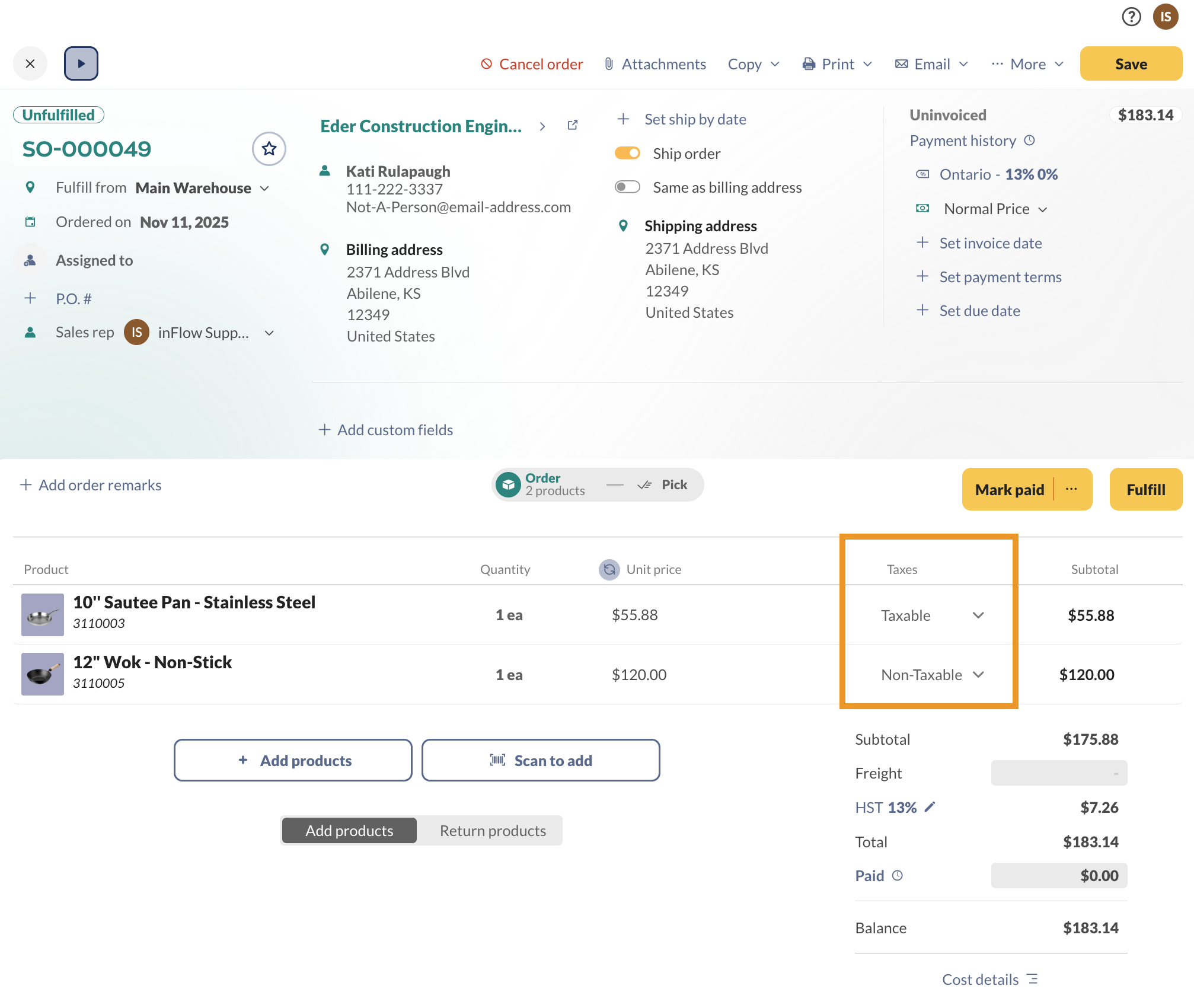 Once you’ve added the special tax codes to inFlow, products in the same order can be taxed differently.