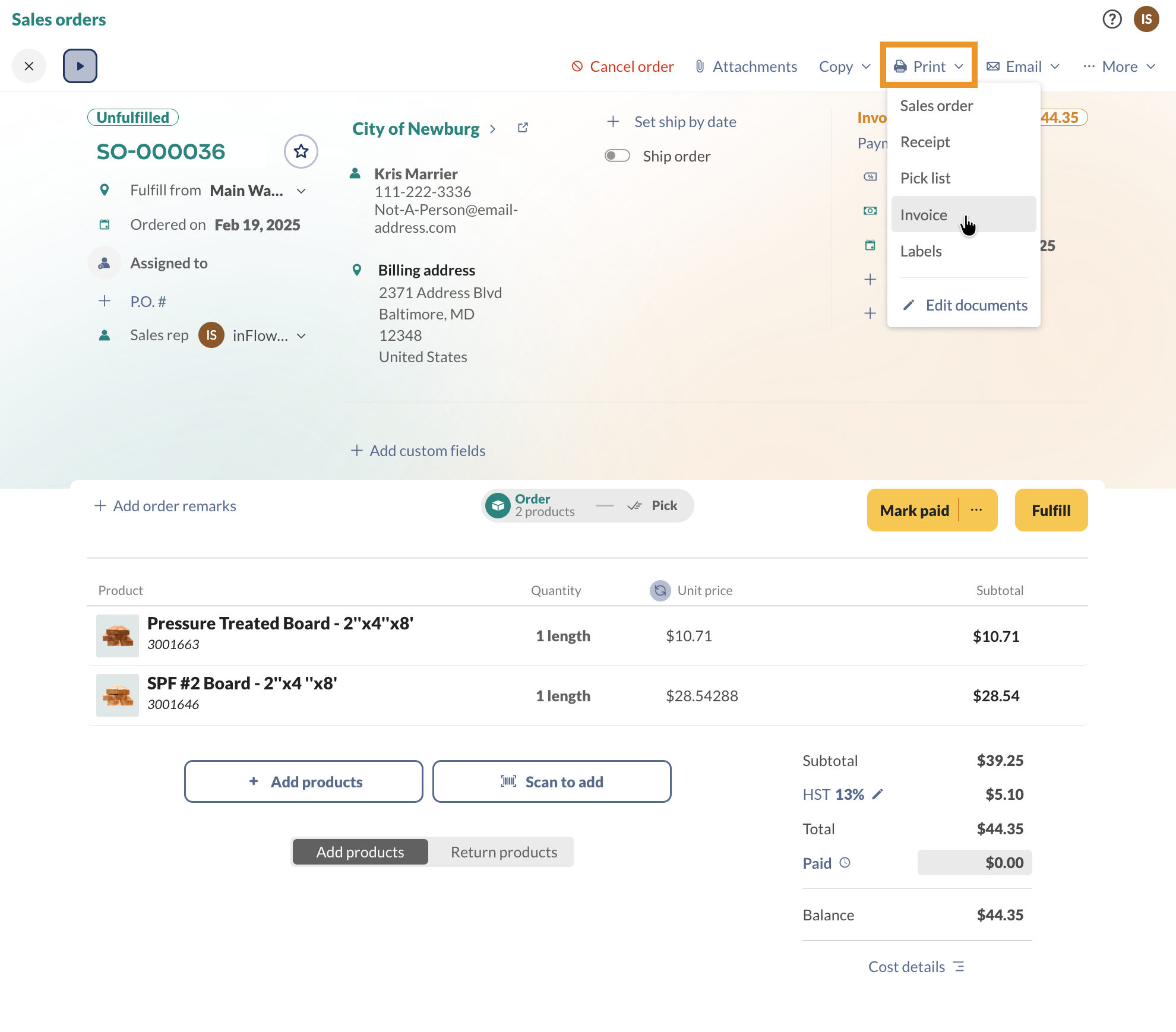 - To start, open an order in inFlow with an Admin account (sales, purchase order, etc.) > then click Print.
