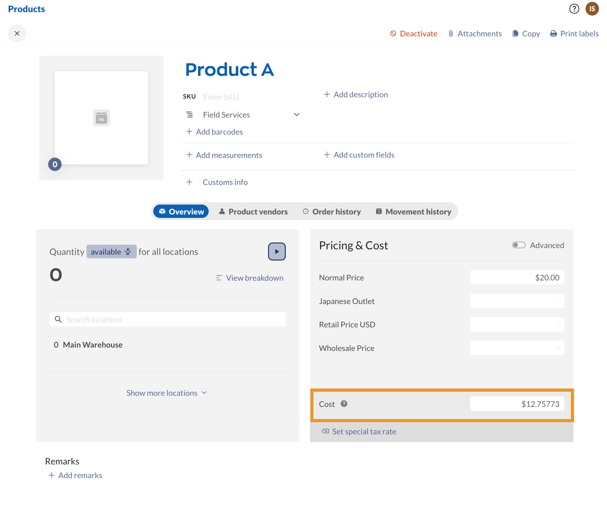 If your vendor charges a separate service fee (e.g., polishing, engraving, machining, etc.), inFlow includes the service fee in the cost calculations as well. You would add this service fee to your purchase order as a service-type item.