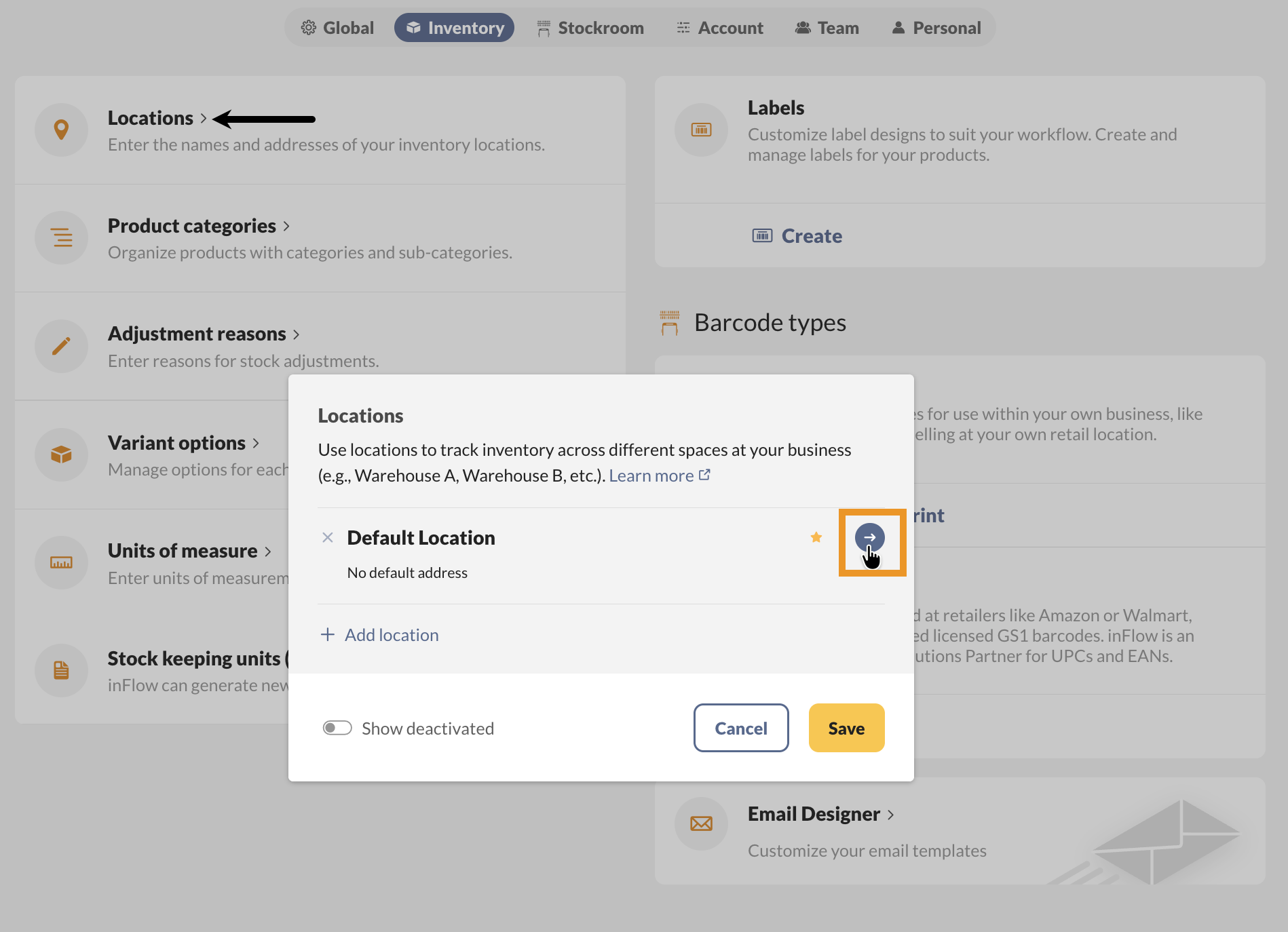 - Go to Stockroom’s Inventory settings (Main Menu>Settings>Inventory), then click on Locations.