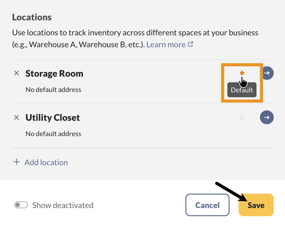 - If you’ve added multiple locations, press the back button, then click on the star next to the location that should be the default in Stockroom.