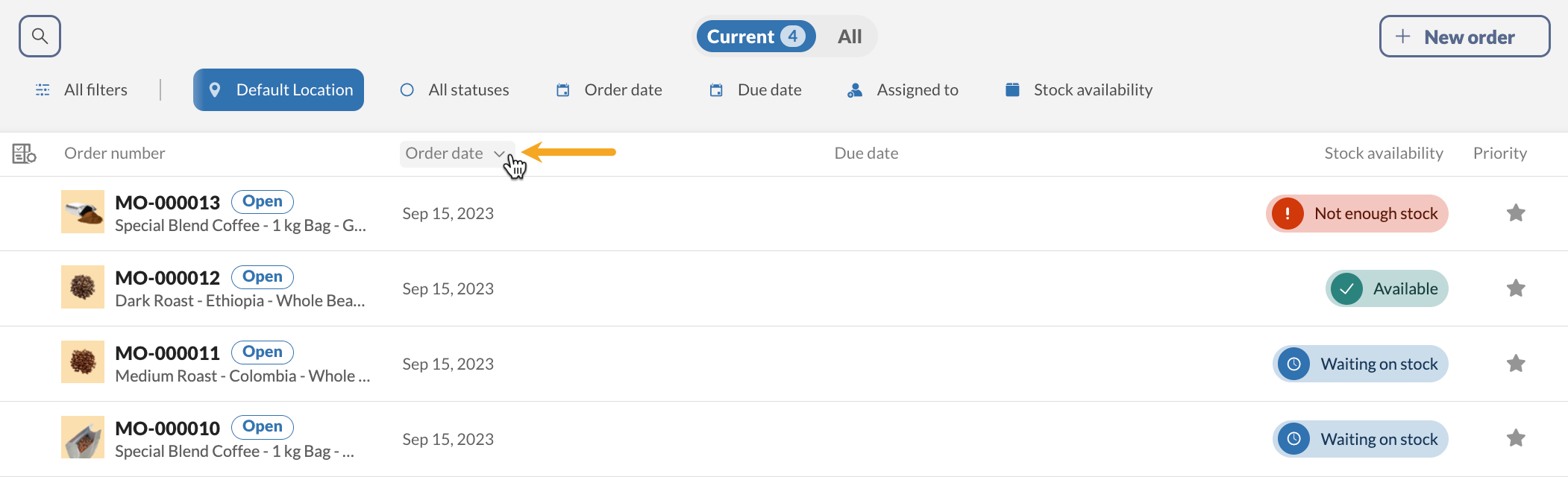 Rearranging the priority list will cause inFlow to recalculate stock levels based on each MO’s position on the list.